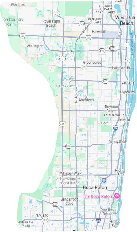 We service as for north as Wellington, West Palm Beach, Royal Palm Beach. As far south as Parkland, Sandalfoot Cove, and Boca Raton. This includes areas like Boynton Beach, Lake Worth Beach, and Delray Beach.